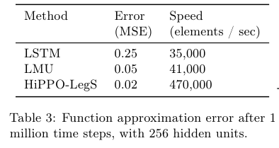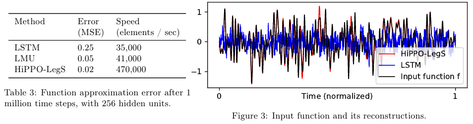 Table 3에서는 hidden units가 256일 때 1백만의 time steps가 지난 다음 함수의 approximation error (MSE로 측정된)를 보여준다. Speed 항목을 보면 HiPPO-LegS가 LSTM이나 LMU보다 훨씬 빠른 속도를 지녔으면서도 MSE가 작음을 알 수 있다.