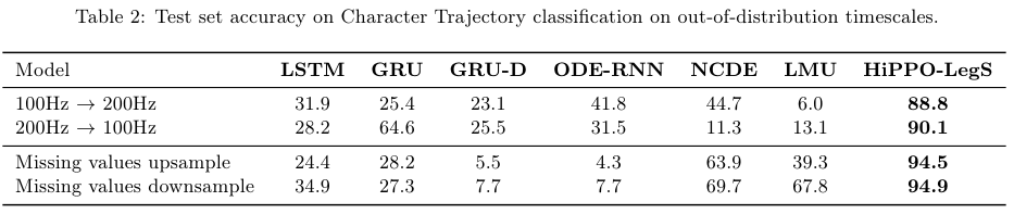 Memory dynamics 메모리 동역학을 recurrent neural networks 순환 신경망에 통합함으로써, HiPPO RNNs는 복잡한 temporal dependencies 시간적 종속성을 empirically 경험적으로 포착할 수 있다. Permuted MNIST 벤치마트 데이터셋에서, HiPPO-LegS는 98.3%라는 SOTA accuracy 정확도를 기록한다. 마지막으로, out-of-distribution timescales 분포 외 시간 스케일 및 missing data 누락된 데이터에 대한 강건성을 테스트하는 novel trajectory classification 작업에서, HiPPO-LegS는 RNN 및 neural ODE 베이스라인들보다 25-40% 더 높은 정확도로 뛰어난 성능을 보인다.