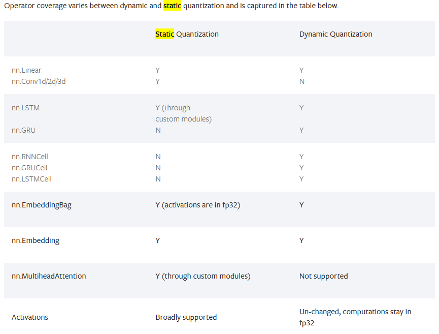 PyTorch의 연산 종류와 적용 가능 양자화 방법