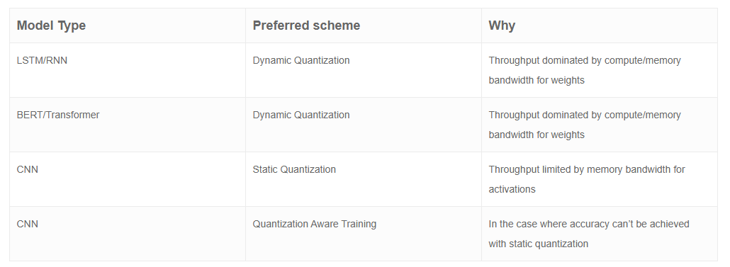 CNN 계열은 Static와 Quantization Aware Training을 권장한다.