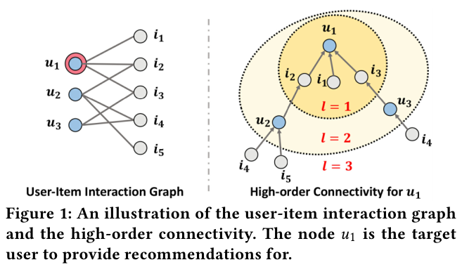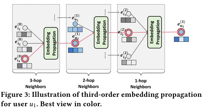 위 Figure 1과 3에서 제시되었듯이, 주어진 노드 $u_1$에 연결된 multi-hop의 이웃 노드들을 embedidng layers를 통해서 학습하여 전파한다. 가장 먼 이웃 노드들에서 부터 가까운 노드로 정보를 전파한다.