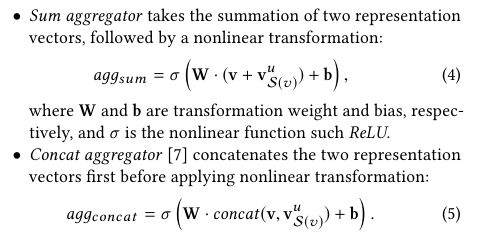 KGCN의 aggergation은 Sum, Concat, Neighbor의 세 종류가 있다.