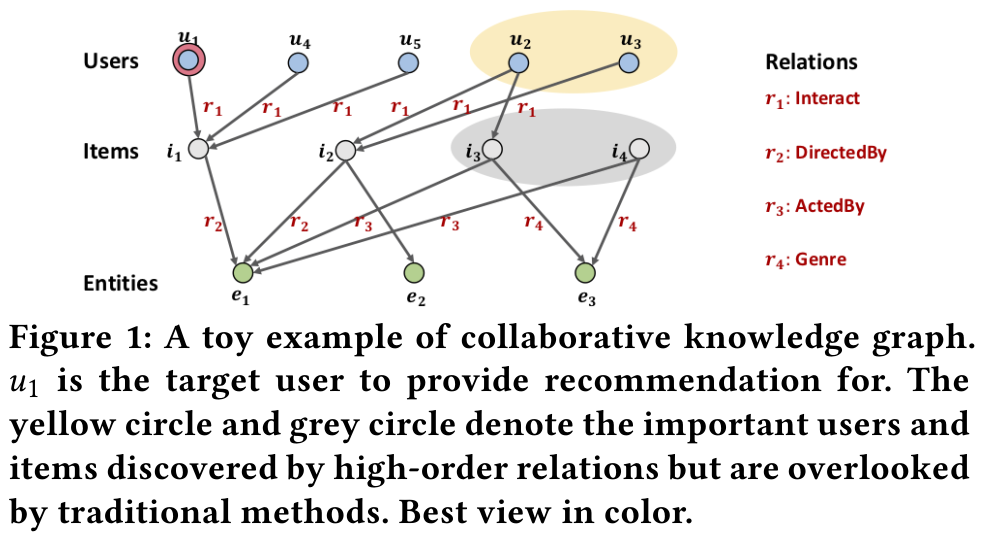 유저 $u$, 아이템 (entity) $v$, 그리고 두 entity 사이의 relation 관계는 $r_{e_i, e_j}$로 표기한다.