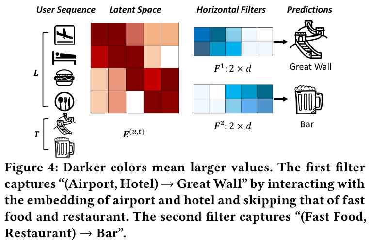 위 Figure 4를 보면 Horizontal conv는 쉽게 이해가 간다.유저의 시퀀스가 $S^u$이고, 그 시퀀스의 길이가 $L$이고, 다음 번의 $T$개의 아이템을 예측하는 상황이다. 이때 필터의 사이즈가 2라면 세션 내에서 2개의 아이템을 위에서 아래의 순서로 학습하게 되는데, 위의 경우 비행기 모양과 숙소 모양을 학습하게 된다. 따라서 그 다음은 여행과 관련된 만리장성을 예측하게 된다. 그 다음 필터에서는 패스트푸드와 식당 2개의 아이템을 학습하므로, 다음 단계에서 이와 관련된 바를 예측하게 된다.