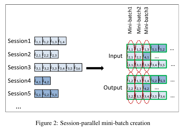 NLP에서는 문장의 단어들을 sliding window에 기반해서 다음 단어를 예측하는데, 이를 기반으로 mini batches를 구성한다. Session 기반 추천의 경우 다음의 2가지를 고려해서 미니 배치를 구성해야 한다. (1) 세션 마다 길이다 다르다. Figure 2를 보면 Session 1의 경우 길이가 4, Session 2에서는 길이가 3, ... 이런식으로 모두 길이가 다르다. (2) 세션이 시간의 흐름에 따라서 어떻게 변화하는지를 파악해야 하기 때문에 단순하게 세션을 쪼개서는 목적을 달성할 수 없다. 따라서 Mini-batch 1은 모든 세션의 첫 번째 이벤트로 구성하고, Mini-batch 2에서는 모든 세션의 두 번째 이벤트로 구성한다. 이때, 각 세션은 모두 독립적이라고 가정한다. 자세한 내용은 위 Figure 2에 그려져있다.