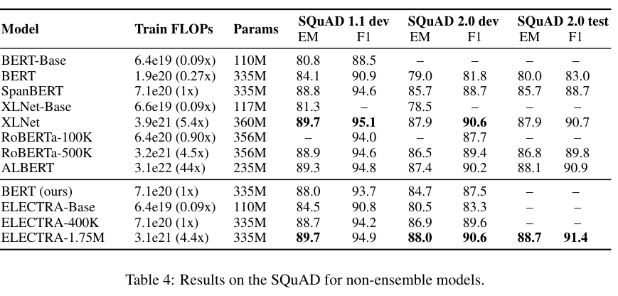 Table 1, 2, 3, 4를 보면 ELECTRA가 대체로 가장 좋은 성능임을 알 수 있다.
