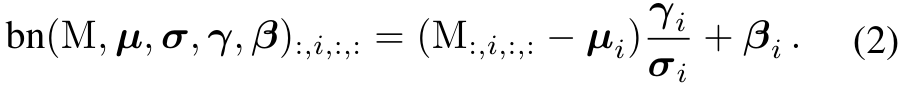 {$W', b'$}는 {$W, \mu, \sigma, \gamma, \beta$}로 부터 변환된 커널과 바이어스다. 따라서 아래 식 (3)을 갖는다.