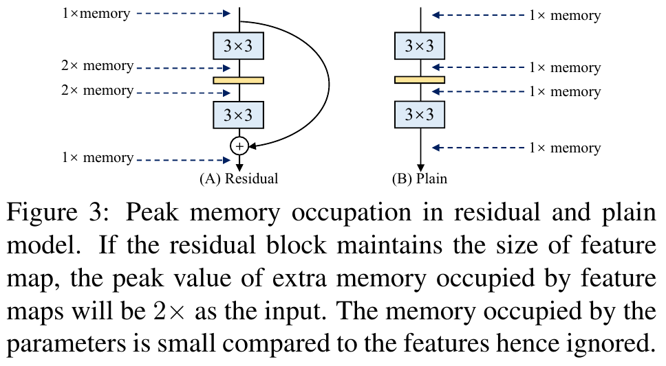 다중 브랜치 토폴로지는 메모리 비효율적이다. 왜냐하면 모든 브랜치의 결과가 덧셈 또는 연결될 때까지 유지되어야 하므로, 메모리 점유의 최대값을 크게 높이기 때문이다. 위에서 제시된 Figure 3은 residual block 잔차 블록에 대한 입력이 덧셈까지 유지되어야 함을 보여준다. 블록이 피쳐 맵 크기를 유지한다고 가정하면, 추가 메모리 점유의 최대값은 입력의 2배다. 이와 대조적으로, 일반 토폴로지는 특정 레이어에 대한 입력이 사용한 메모리가 연산이 완료되면 즉시 해제될 수 있도록 한다. 특화된 하드웨어를 설계할 때, 일반 ConvNet은 깊은 메모리 최적화를 가능하게 하고 메모리 장치 비용을 줄여서 칩에 더 많은 컴퓨팅 장치를 통합할 수 있게 한다.