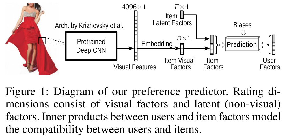 VBPR의 전체적인 과정을 아래와 같다. AlexNet을 사용해서 visual features를 추출하고 이를 visual factors로 변환한다. 그 다음 기존의 item latent factors, user factors, biases와 함께 user-item relation 사용자-상품 선호를 예측한다.