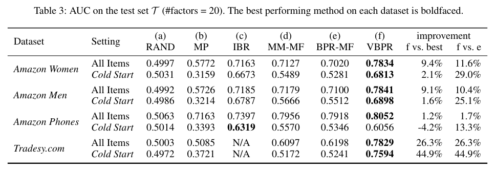 VBPR이 상호작용에 대한 정보가 풍부한 아이템들 뿐만 아니라 Cold Start 아이템들에 대해서도 추천을 원활하게 함을 알 수 있다.