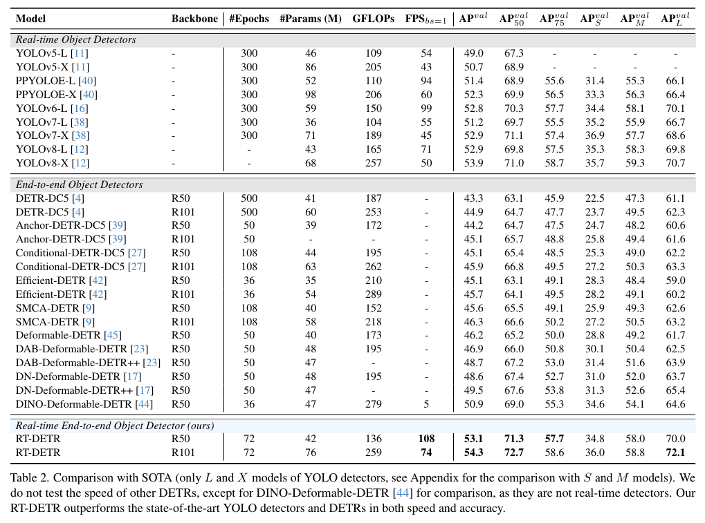 RT-DETR이 높은 FPS를 지녀서 빠르게 처리하면서도 AP가 높아서 좋은 성능임을 알 수 있다.