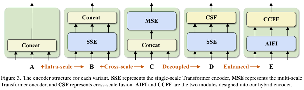 A → B: Variant A에 single scale Transformer encoder (SSE)를 삽입한다. Intra-scale는 피쳐 멀티 스케일 피쳐들의 상호작용을 위한 동일한 인코더를 공유하며 concatenate해서 결과를 출력한다.