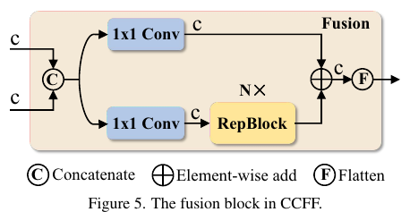 CCFF는 CNN 계층으로 구성된 여러 개의 fusion blocks를 fusion path에 삽입하는 cross-scale fusion 모듈을 기반으로 최적화된다. Fusion blocks의 역할은 두 개의 인접한 스케일 피쳐를 새로운 피쳐로 합성하는 것이며, 그 구조는 아래 Figure 5에 나와 있다. Fusion blocks 은 채널 수를 조정하기 위해 두 개의 1 × 1 컨볼루션을 포함한다. RepConv로 구성된 N개의 RepBlock이 feature fusion에 사용되고, 두 fusion path는 element-wise addition을 통해 합성된다.