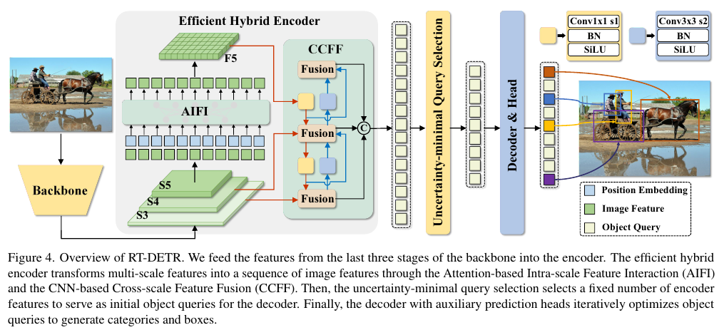 RT-DETR는 백본, efficient hybrid encoder, 그리고 auxiliary prediction head 보조 예측 헤드를 지닌 Transformer decoder의 세 부분으로 구성된다. 전반적인 구조는 Figure 4에 그려져있다. 백본의 마지막 3개 스테이지인 {$S_3, S_4, S_5$}에 features를 주입한다. Efficient hybrid encoder는 multi-scale features를 sequence of image features로 변환하는데, 이때 intra-scale features interaction과 cross-scale feature fusion을 통해서 이룩한다. 그 뒤에 uncertainty-miniumal query selection 불확실성 최소화 쿼리 선택을 적용해 고정된 숫자의 인코더 피쳐를 선택하고 이를 디코더의 초기 객체 쿼리값으로 사용한다. 마지막으로 디코더는 보조 예측 헤드를 통해서 객체 쿼리값을 반복적으로 최적화하여 categories와 boxes를 예측한다.