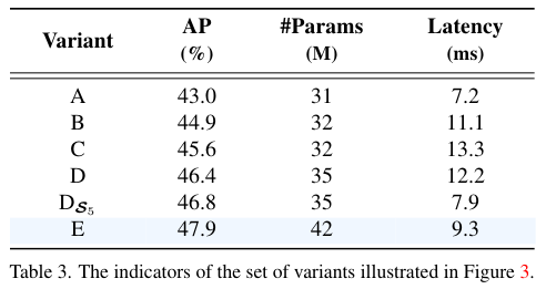 구체적으로, AIFI는 싱글 스케일 트랜스포머 인코더를 사용하여 $S_5$에서만 intra-scale 상호작용을 수행함으로써 variant D에 기반한 계산 비용을 더욱 줄인. 그 이유는 더 풍부한 의미 개념을 가진 고수준 피쳐에 셀프 어텐션 연산을 적용하면 개념적 개체 간의 연결을 포착하여 후속 모듈에서 객체의 위치 지정 및 인식을 용이하게 만들기 때문이다. 그러나 저수준 피쳐의 스케일 내 상호작용은 의미 개념이 부족하고 고수준 피쳐 상호작용과 중복 및 혼동될 위험이 있기 때문에 불필요하다. 이 의견을 검증하기 위해 변형 D에서 $S_5$에서만 intra-scale 상호작용을 수행했으며 실험 결과는 Table (행 $D_{S_5}$ 참조)에 보고되었다. D와 비교하여 $D_{S_5}$ 는 지연 시간을 크게 줄일 뿐만 아니라 (35% 더 빠름) 정확도도 향상시킨다 (AP 0.4% 더 높음).