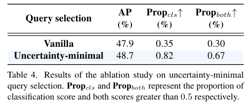 DETR에서 객체 질의 최적화의 어려움을 줄이기 위해, 여러 후속 연구를 토대로 한 질의 선택 기법을 제안한다. 이전 연구들은 공통적으로 confidence scores 신뢰도 점수를 사용하여 인코더에서 상위 K개의 피쳐를 선택하여 object queries 객체 질의 (또는 position quereis 위치 질의)로 초기화한다. 신뢰도 점수는 피쳐가 foreground objects 전경 객체를 포함할 가능성을 나타낸다. 그럼에도 불구하고 탐지기들은 객체의 category 범주와 location 위치를 동시에 모델링해야 하며, 이 두 가지는 피쳐의 품질을 결정한다. 따라서 피쳐의 performance score 성능 점수는 분류 및 위치 추정과 공동으로 상관관계가 있는 latent variable 잠재 변수다. 분석 결과 현재의 쿼리 선택은 선택된 특징으로 하여금 상당한 수준의 unceratainty 불확실성을 초래하여 디코더의 최적이 아닌 초기화를 초래하고 탐지기의 성능을 저해하는 결과를 가져온다.
