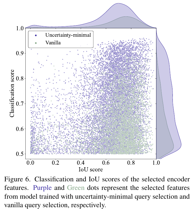 COCO val 2017에 대해서 불확실성 최소화 쿼리 선택이 classificatio scores와 IoU scores에 얼마나 효율적인지를 아래 Figure 6에서 보여준다. 분류 점수가 0.5 이상인 경우에 대해서만 scatterplot을 그린다.