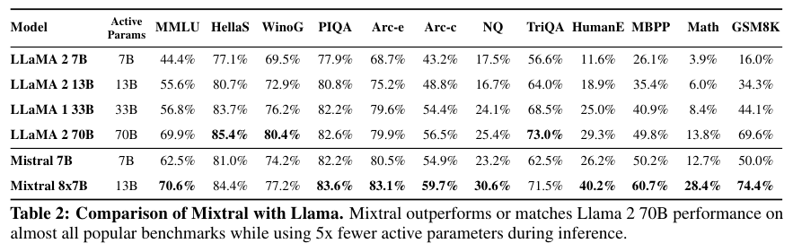 성능은 위 Table 2에 나와있다. 대체로 Mixtral 8x7B가 가장 성능을 달성했다.