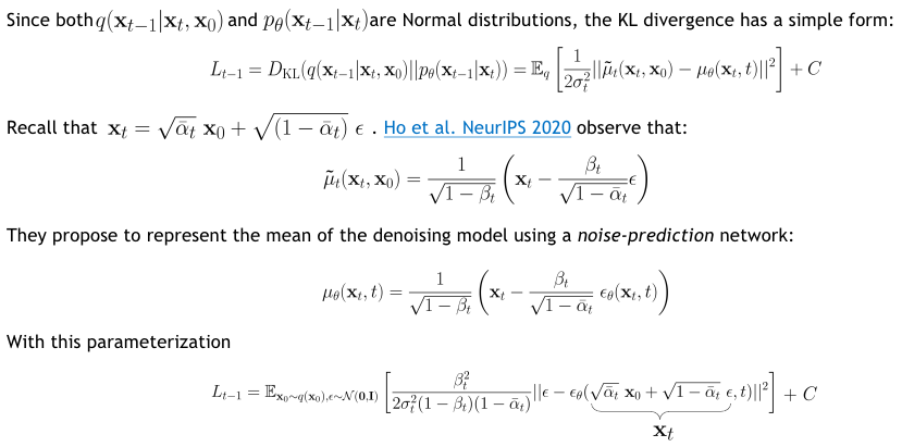 이때 위 $\epsilon$은 선택된 타임 스텝 $t$에서, 원본 데이터 $x_0$에 추가하는 실제 노이즈다.