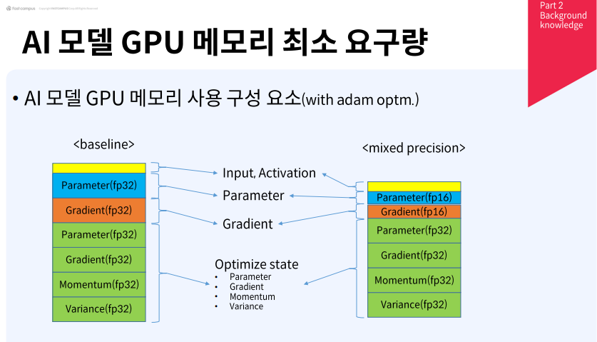 Input, Activation, Parameter, Gradient, Optimize State (Adam의 경우 Parameter, Gradient, Momentum, Variance)를 모두 fp32로 나타낼 수도 있고, Optimizer가 아닌 파트는 fp16으로 나타내는 mixed precision을 사용할 수도 있다.