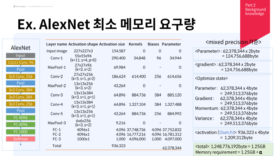 AlexNet의 경우 약 61M parameters다. 따라서 61 x 100,000 x 20 + $\alpha$ = 1.22 GB + $\alpha$